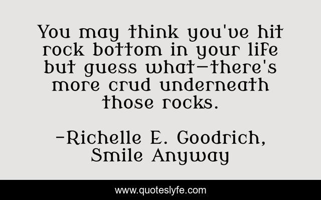 This page presents the quote "You may think you've hit rock bottom in your life but guess what—there's more crud underneath those rocks.". Author of this quote is Richelle E. Goodrich, Smile Anyway. This quote is about setbacks, misfortune, upset, life, difficulties, richelle, disappointment, defeat, richelle-goodrich,.
