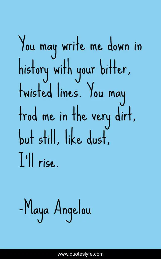 This page presents the quote "You may write me down in history with your bitter, twisted lines. You may trod me in the very dirt, but still, like dust, I'll rise.". Author of this quote is Maya Angelou. This quote is about me, rise,.