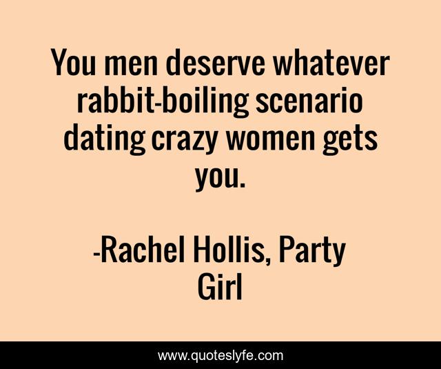 This page presents the quote "You men deserve whatever rabbit-boiling scenario dating crazy women gets you.". Author of this quote is Rachel Hollis, Party Girl. This quote is about crazy, dating, humor,.