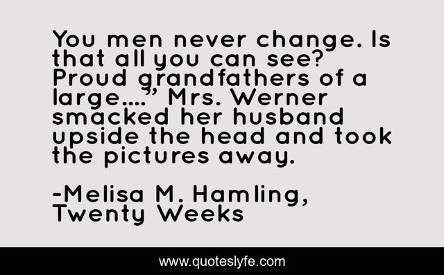 This page presents the quote "You men never change. Is that all you can see? Proud grandfathers of a large....” Mrs. Werner smacked her husband upside the head and took the pictures away.". Author of this quote is Melisa M. Hamling, Twenty Weeks. This quote is about family-relationships, mothers,.