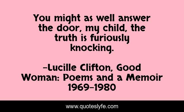 This page presents the quote "You might as well answer the door, my child, the truth is furiously knocking.". Author of this quote is Lucille Clifton, Good Woman: Poems and a Memoir 1969-1980. This quote is about enthusiasm, inspirational,.
