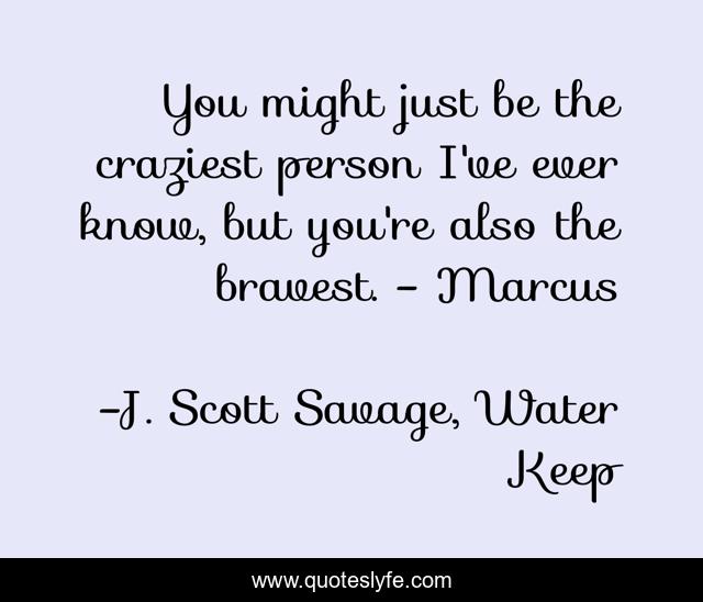 This page presents the quote "You might just be the craziest person I've ever know, but you're also the bravest. - Marcus". Author of this quote is J. Scott Savage, Water Keep. This quote is about crazy, brave, courage, crazy-people, courageous, bravery,.