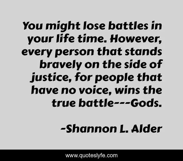 This page presents the quote "You might lose battles in your life time. However, every person that stands bravely on the side of justice, for people that have no voice, wins the true battle---Gods.". Author of this quote is Shannon L. Alder. This quote is about freedom-of-speech, honesty, health-care, saving-lives, life-missions, homeless, integrity, christlike, justice,.