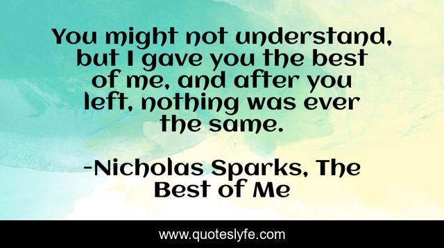 This page presents the quote "You might not understand, but I gave you the best of me, and after you left, nothing was ever the same.". Author of this quote is Nicholas Sparks, The Best of Me. This quote is about the-best-of-me, love, nicholas-sparks, romance, dawson-cole, affection,.