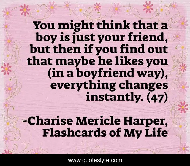 This page presents the quote "You might think that a boy is just your friend, but then if you find out that maybe he likes you (in a boyfriend way), everything changes instantly. (47)". Author of this quote is Charise Mericle Harper, Flashcards of My Life. This quote is about relationships, boyfriends, friendship,.