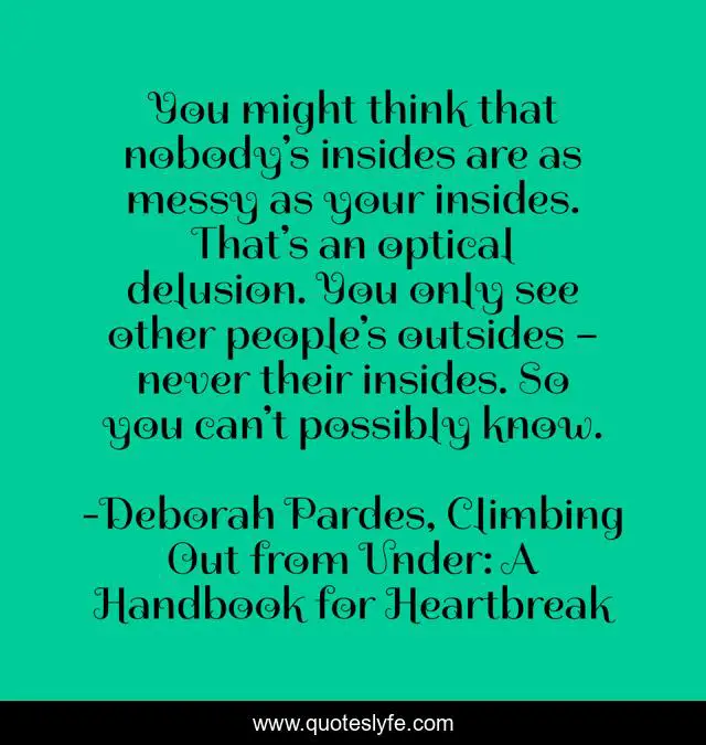 This page presents the quote "You might think that nobody’s insides are as messy as your insides. That’s an optical delusion. You only see other people’s outsides – never their insides. So you can’t possibly know.". Author of this quote is Deborah Pardes, Climbing Out from Under: A Handbook for Heartbreak. This quote is about heartbreak, healing,.
