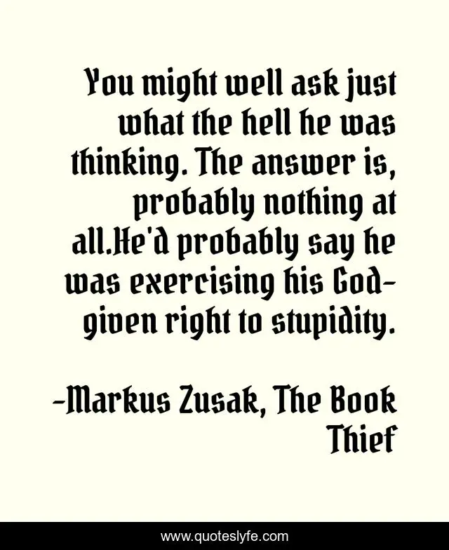 This page presents the quote "You might well ask just what the hell he was thinking. The answer is, probably nothing at all.He'd probably say he was exercising his God-given right to stupidity.". Author of this quote is Markus Zusak, The Book Thief. This quote is about stupidity, the-book-thief, rudy-steiner,.