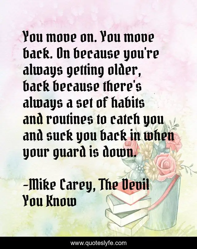 This page presents the quote "You move on. You move back. On because you're always getting older, back because there's always a set of habits and routines to catch you and suck you back in when your guard is down.". Author of this quote is Mike Carey, The Devil You Know. This quote is about habits, growing-up, moving-on,.