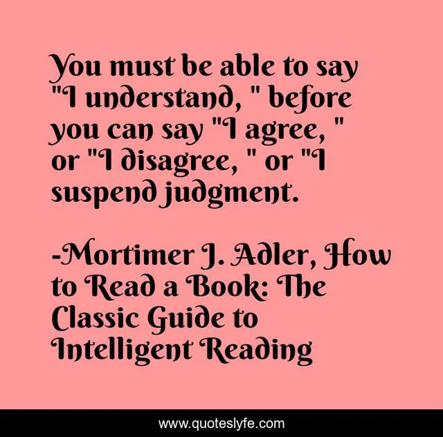 This page presents the quote "You must be able to say "I understand, " before you can say "I agree, " or "I disagree, " or "I suspend judgment.". Author of this quote is Mortimer J. Adler, How to Read a Book: The Classic Guide to Intelligent Reading. This quote is about criticism, discussion, disagreement, agreement, understanding, judgement, critical-thinking,.