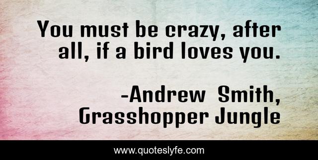 This page presents the quote "You must be crazy, after all, if a bird loves you.". Author of this quote is Andrew Smith, Grasshopper Jungle. This quote is about crazy, birds,.