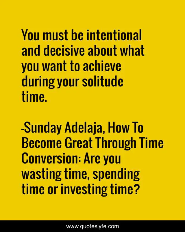 This page presents the quote "You must be intentional and decisive about what you want to achieve during your solitude time.". Author of this quote is Sunday Adelaja, How To Become Great Through Time Conversion: Are you wasting time, spending time or investing time?. This quote is about solitude, life, product, calling, decisions, conversion, productivity, wealth, greatness,.