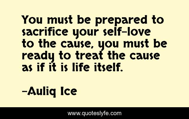This page presents the quote "You must be prepared to sacrifice your self-love to the cause, you must be ready to treat the cause as if it is life itself.". Author of this quote is Auliq Ice. This quote is about true-love, self-love, love, character, charity-work, affection, charity,.