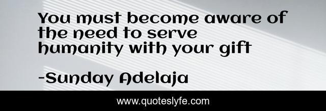 This page presents the quote "You must become aware of the need to serve humanity with your gift". Author of this quote is Sunday Adelaja. This quote is about self-awareness, gift, talent, humanity, service,.