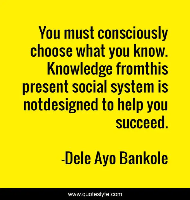 This page presents the quote "You must consciously choose what you know. Knowledge fromthis present social system is notdesigned to help you succeed.". Author of this quote is Dele Ayo Bankole. This quote is about lifematics, life, knowledge, wisdom,.