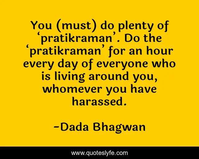 This page presents the quote "You (must) do plenty of ‘pratikraman’. Do the ‘pratikraman’ for an hour every day of everyone who is living around you, whomever you have harassed.". Author of this quote is Dada Bhagwan. This quote is about pratikraman, spiritual,.