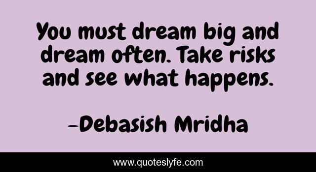 This page presents the quote "You must dream big and dream often. Take risks and see what happens.". Author of this quote is Debasish Mridha. This quote is about dream-big, philosophy, debasish-mridha, quotes, see-what-happens, inspirational, take-risks, enthusiasm, you-must-dream-big,.