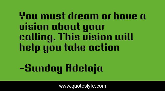 This page presents the quote "You must dream or have a vision about your calling. This vision will help you take action". Author of this quote is Sunday Adelaja. This quote is about revelation, dream, purpose, vision,.
