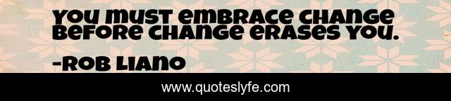 This page presents the quote "You must embrace change before change erases you.". Author of this quote is Rob Liano. This quote is about confidence, positive, motivational, growth, optimistic, inspirational, enthusiasm, change-management, change,.
