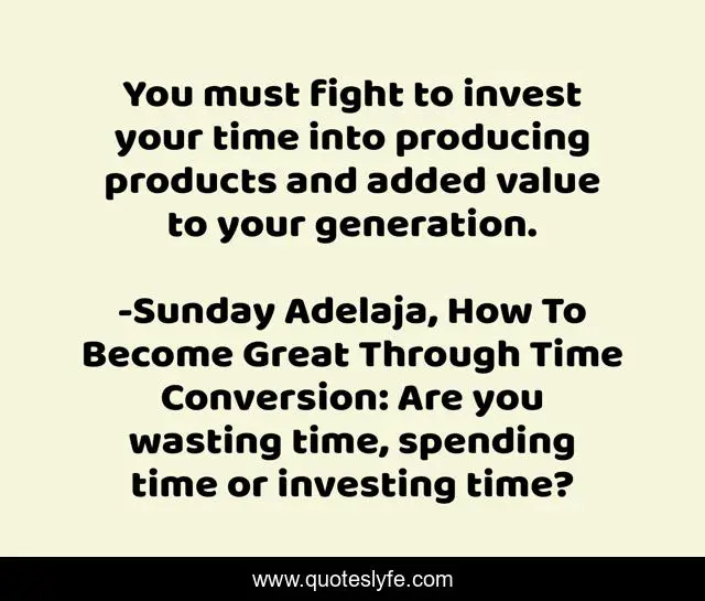This page presents the quote "You must fight to invest your time into producing products and added value to your generation.". Author of this quote is Sunday Adelaja, How To Become Great Through Time Conversion: Are you wasting time, spending time or investing time?. This quote is about generation, life, investment, conversion, productivity, wealth, fight, time-investment, greatness,.