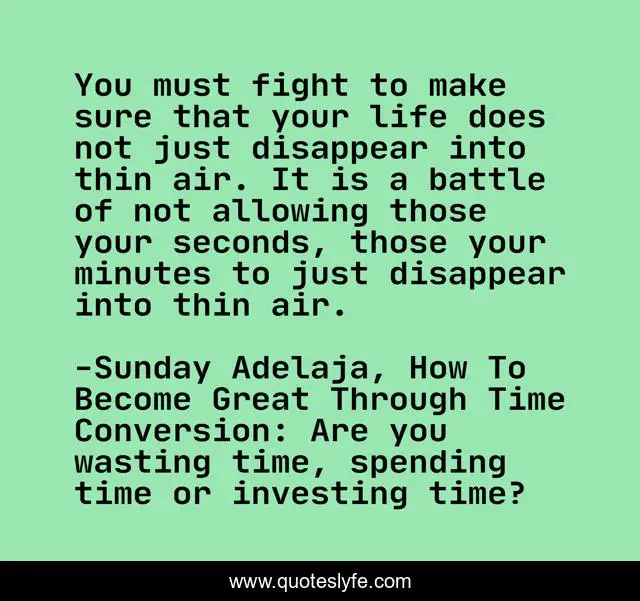 This page presents the quote "You must fight to make sure that your life does not just disappear into thin air. It is a battle of not allowing those your seconds, those your minutes to just disappear into thin air.". Author of this quote is Sunday Adelaja, How To Become Great Through Time Conversion: Are you wasting time, spending time or investing time?. This quote is about fights, life, diminishing-life, battle, conversion, productivity, wealth, greatness, waste,.