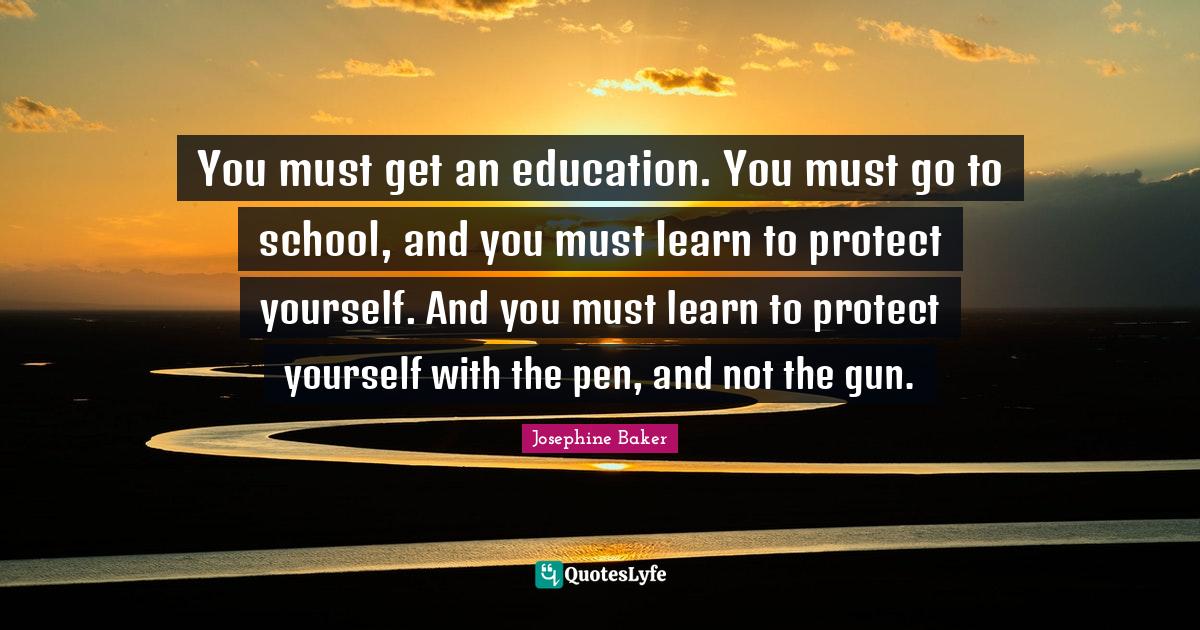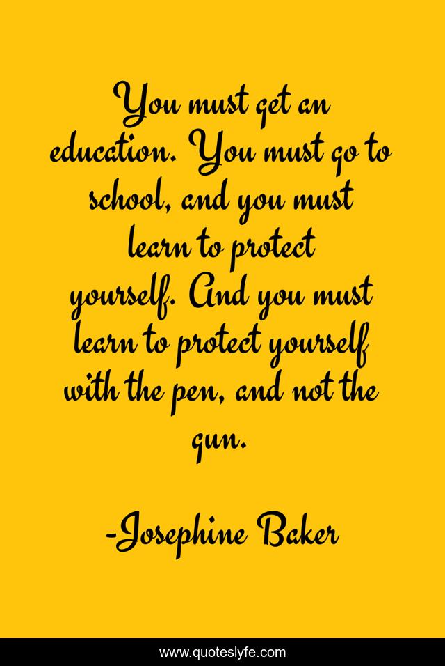 This page presents the quote "You must get an education. You must go to school, and you must learn to protect yourself. And you must learn to protect yourself with the pen, and not the gun.". Author of this quote is Josephine Baker. This quote is about school, yourself,.