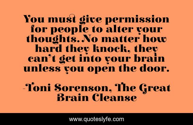 This page presents the quote "You must give permission for people to alter your thoughts. No matter how hard they knock, they can’t get into your brain unless you open the door.". Author of this quote is Toni Sorenson, The Great Brain Cleanse. This quote is about brain, life, motivation, thoughts, inspiration,.