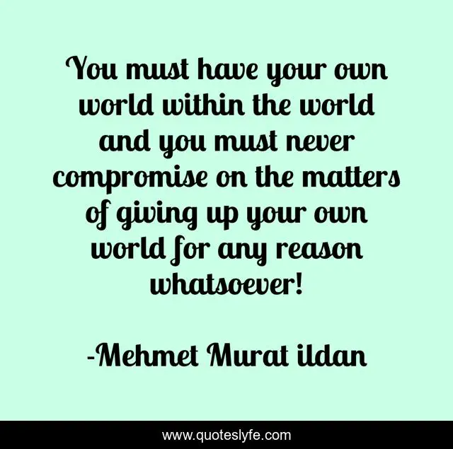 This page presents the quote "You must have your own world within the world and you must never compromise on the matters of giving up your own world for any reason whatsoever!". Author of this quote is Mehmet Murat ildan. This quote is about mehmet-murat-ildan, ildan-wise-sayings, turkish, ildan-wisdom, turkish-playwrights, own-world, turkish-wisdom-words, turkish-writers, turkish-literature,.