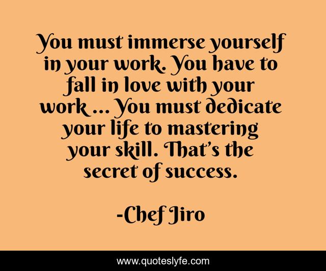 This page presents the quote "You must immerse yourself in your work. You have to fall in love with your work … You must dedicate your life to mastering your skill. That’s the secret of success.". Author of this quote is Chef Jiro. This quote is about mastery, mastery-of-skills, success,.