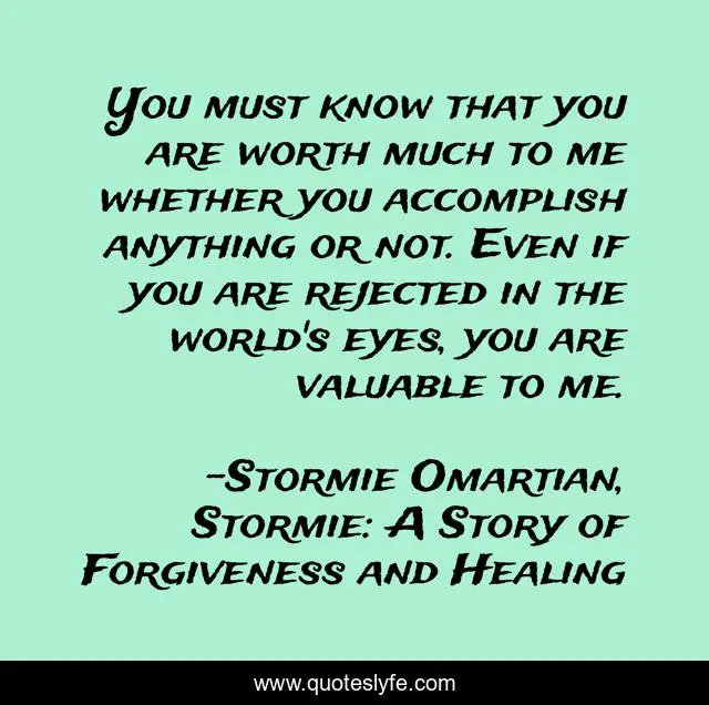 This page presents the quote "You must know that you are worth much to me whether you accomplish anything or not. Even if you are rejected in the world's eyes, you are valuable to me.". Author of this quote is Stormie Omartian, Stormie: A Story of Forgiveness and Healing. This quote is about god, identity, value, worth,.