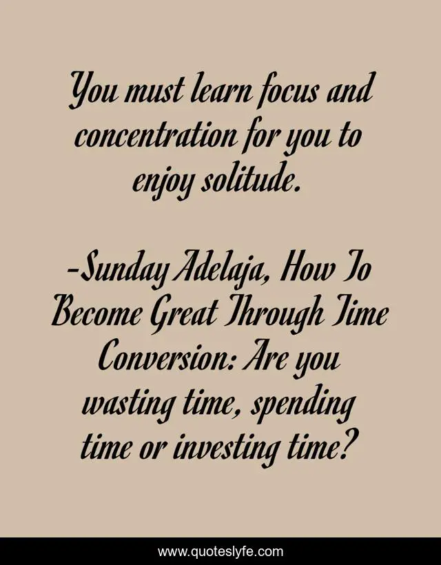 This page presents the quote "You must learn focus and concentration for you to enjoy solitude.". Author of this quote is Sunday Adelaja, How To Become Great Through Time Conversion: Are you wasting time, spending time or investing time?. This quote is about solitude, life, concentration, conversion, productivity, wealth, greatness, waste, humanity,.