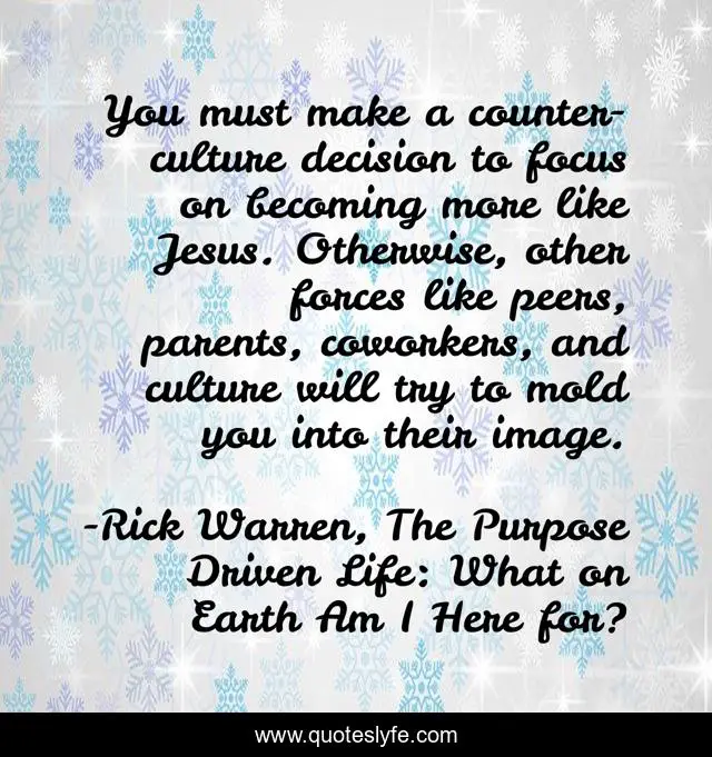 This page presents the quote "You must make a counter-culture decision to focus on becoming more like Jesus. Otherwise, other forces like peers, parents, coworkers, and culture will try to mold you into their image.". Author of this quote is Rick Warren, The Purpose Driven Life: What on Earth Am I Here for?. .