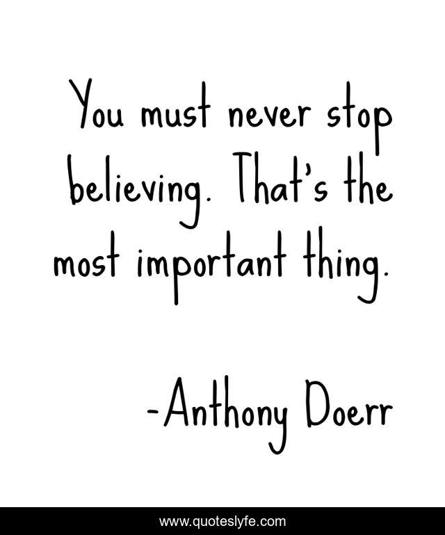 This page presents the quote "You must never stop believing. That’s the most important thing.". Author of this quote is Anthony Doerr. This quote is about faith, life, positive-thinking,.