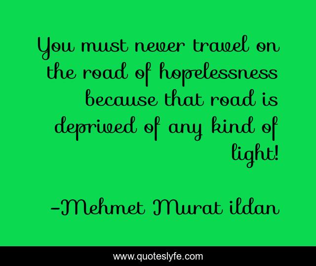 This page presents the quote "You must never travel on the road of hopelessness because that road is deprived of any kind of light!". Author of this quote is Mehmet Murat ildan. This quote is about turkish-aphorisms, mehmet-murat-ildan, ildan-wise-sayings, turkish, ildan-wisdom, turkish-sayings, turkish-playwrights, turkish-wisdom-words, turkish-writers,.