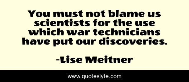 This page presents the quote "You must not blame us scientists for the use which war technicians have put our discoveries.". Author of this quote is Lise Meitner. This quote is about war-technicians, science, war, blame, scientists, discoveries,.