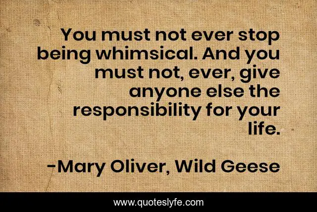 This page presents the quote "You must not ever stop being whimsical. And you must not, ever, give anyone else the responsibility for your life.". Author of this quote is Mary Oliver, Wild Geese. This quote is about life, whimsy, inspiration,.