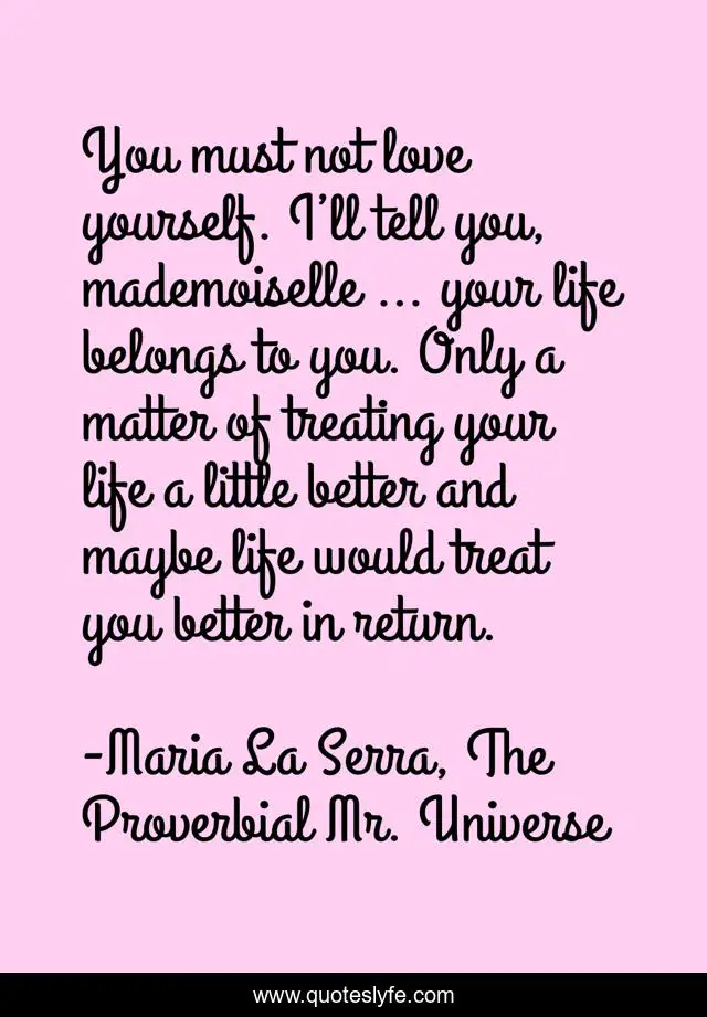 This page presents the quote "You must not love yourself. I’ll tell you, mademoiselle … your life belongs to you. Only a matter of treating your life a little better and maybe life would treat you better in return.". Author of this quote is Maria La Serra, The Proverbial Mr. Universe. This quote is about life, love, inspirational, philosophy, life-and-sayings, life-lessons, life-changing, enthusiasm, affection,.