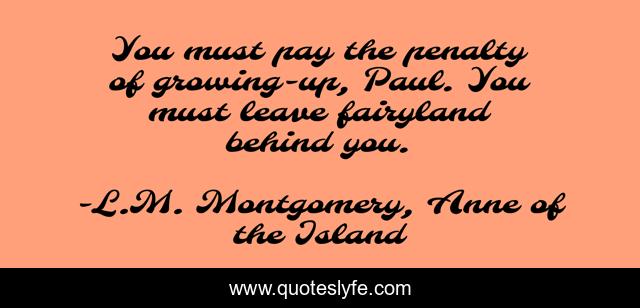 This page presents the quote "You must pay the penalty of growing-up, Paul. You must leave fairyland behind you.". Author of this quote is L.M. Montgomery, Anne of the Island. This quote is about l-m-montgomery, fairyland, growing-up,.