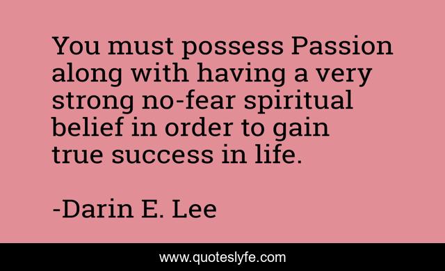 This page presents the quote "You must possess Passion along with having a very strong no-fear spiritual belief in order to gain true success in life.". Author of this quote is Darin E. Lee. This quote is about confidence, quote, motivational, quotes, optimistic, inspirational, positive, enthusiasm,.