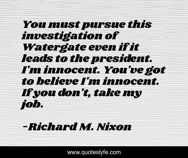 This page presents the quote "You must pursue this investigation of Watergate even if it leads to the president. I'm innocent. You've got to believe I'm innocent. If you don't, take my job.". Author of this quote is Richard M. Nixon. This quote is about job, believe,.