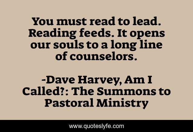 This page presents the quote "You must read to lead. Reading feeds. It opens our souls to a long line of counselors.". Author of this quote is Dave Harvey, Am I Called?: The Summons to Pastoral Ministry. This quote is about advice, pastoral-ministry,.