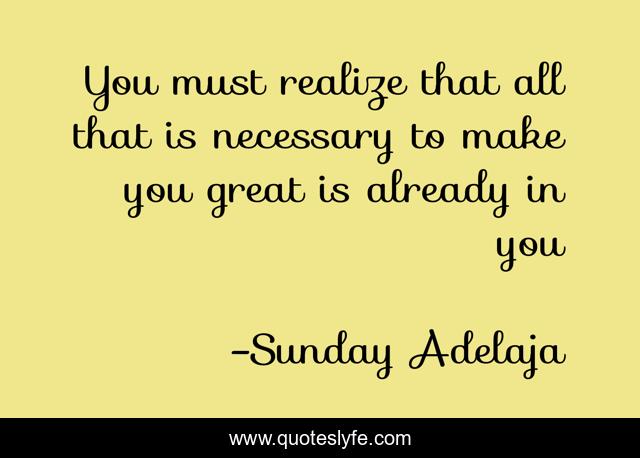 This page presents the quote "You must realize that all that is necessary to make you great is already in you". Author of this quote is Sunday Adelaja. This quote is about purpose, calling-fulfillment, life, goals,.