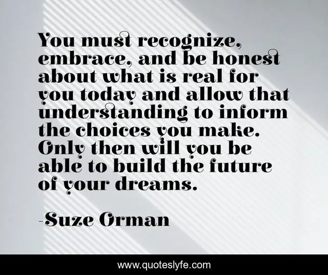 This page presents the quote "You must recognize, embrace, and be honest about what is real for you today and allow that understanding to inform the choices you make. Only then will you be able to build the future of your dreams.". Author of this quote is Suze Orman. This quote is about your dreams, future, today,.