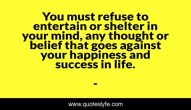 This page presents the quote "You must refuse to entertain or shelter in your mind, any thought or belief that goes against your happiness and success in life.". Author of this quote is . This quote is about your-success-in-life, belief, edmond-mbiaka, thought, shelter, entertain, your-mind, beliefs, thoughts,.