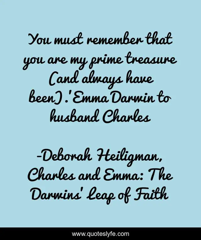 This page presents the quote "You must remember that you are my prime treasure (and always have been).'Emma Darwin to husband Charles". Author of this quote is Deborah Heiligman, Charles and Emma: The Darwins' Leap of Faith. This quote is about love, marriage, way-to-be, affection, tenderness,.