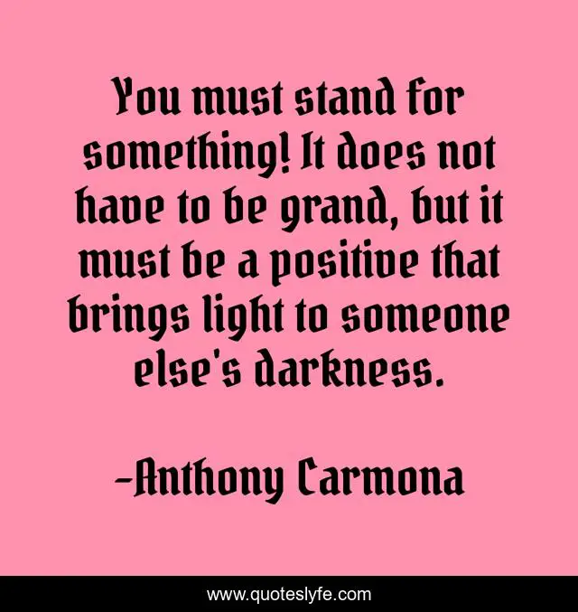 This page presents the quote "You must stand for something! It does not have to be grand, but it must be a positive that brings light to someone else's darkness.". Author of this quote is Anthony Carmona. This quote is about light, darkness,.