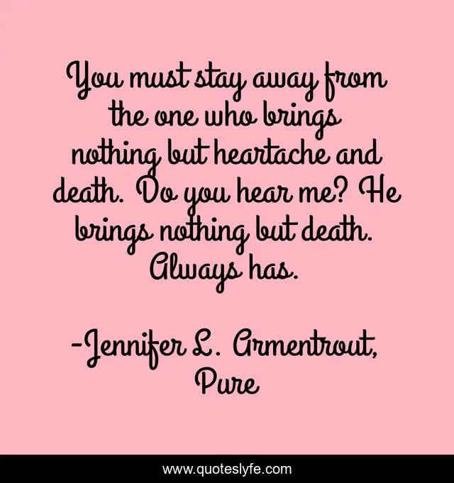 This page presents the quote "You must stay away from the one who brings nothing but heartache and death. Do you hear me? He brings nothing but death. Always has.". Author of this quote is Jennifer L. Armentrout, Pure. This quote is about heartache, death, love, men, warning, affection,.