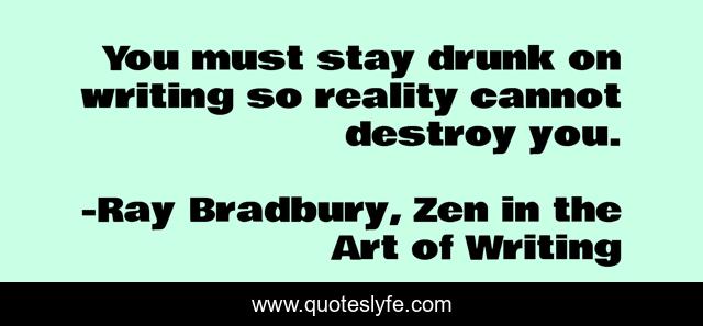 This page presents the quote "You must stay drunk on writing so reality cannot destroy you.". Author of this quote is Ray Bradbury, Zen in the Art of Writing. .