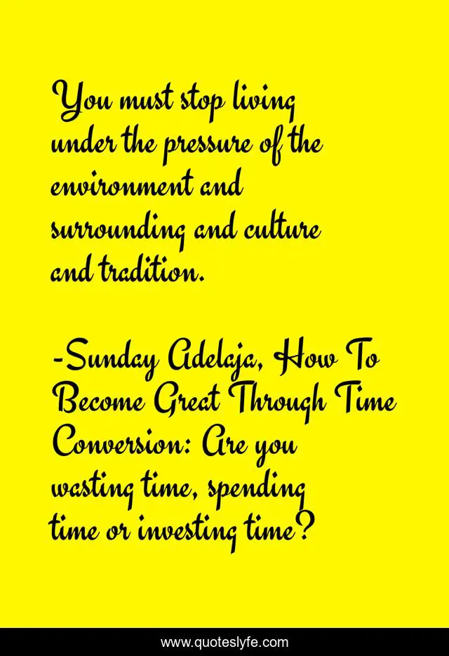 This page presents the quote "You must stop living under the pressure of the environment and surrounding and culture and tradition.". Author of this quote is Sunday Adelaja, How To Become Great Through Time Conversion: Are you wasting time, spending time or investing time?. This quote is about traditions, life, culture, conversion, productivity, wealth, environment, surroundings, greatness,.
