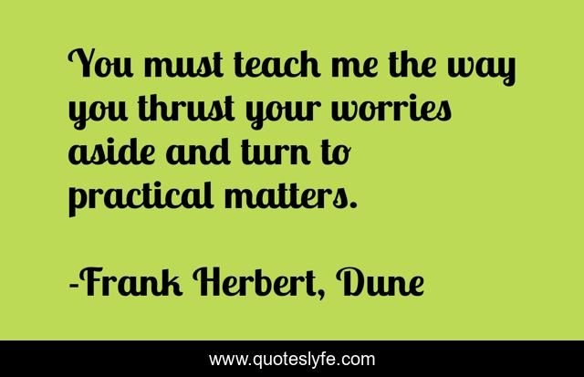 This page presents the quote "You must teach me the way you thrust your worries aside and turn to practical matters.". Author of this quote is Frank Herbert, Dune. This quote is about anxiety, thought-life, discipleship, ministry,.