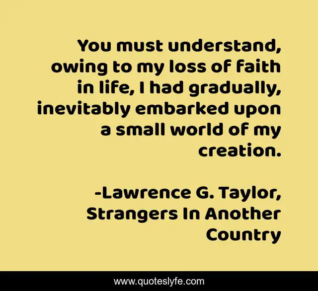 This page presents the quote "You must understand, owing to my loss of faith in life, I had gradually, inevitably embarked upon a small world of my creation.". Author of this quote is Lawrence G. Taylor, Strangers In Another Country. This quote is about loss, small-world, living-in-my-own-world, my-own-creation, you-must-understand, understand, loss-of-faith, detachment,.